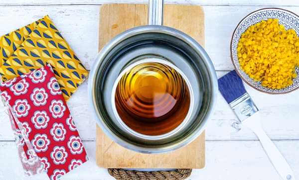 Leere Konservendose gut säubern und in einen Topf mit kochendem Wasser stellen. Bienenwachspastillen darin schmelzen. Wenn Sie mit Stabkerzen arbeiten, diese zuvor zerkleinern, den Docht entfernen und ebenfalls im Topf schmelzen.