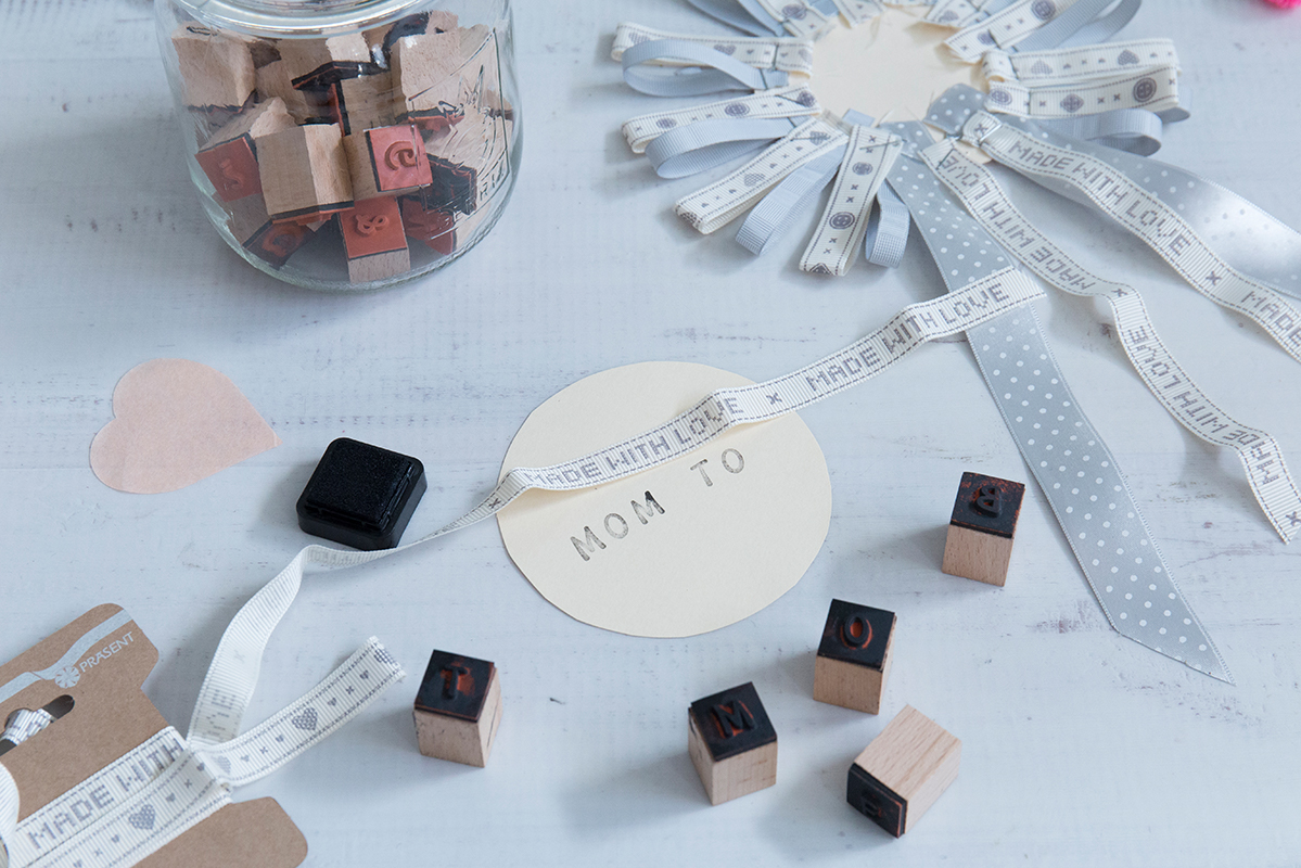 Auf den zweiten Kreis mit den Buchstabenstempeln "Mom to be“ schreiben. Hier evtl. auch nochmals mit den Bändern verzieren. Den Kreis mit Heißkleber auf den anderen Kreis aufkleben.