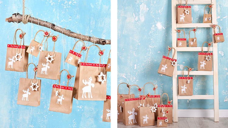 Nehmen Sie 24 unterschiedlich große Geschenktüten mit Weihnachtsmotiven und legen Sie in jede Tüte ein kleines Geschenk.