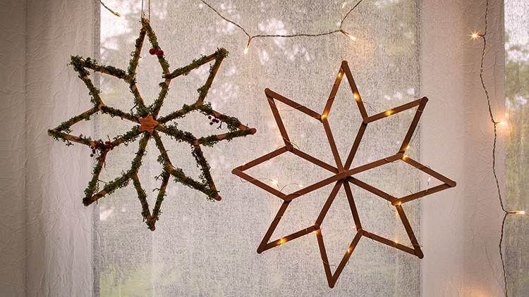 Deko mit Heißkleber auf den Stern kleben oder Stiele mit einer Lichterkette umwickeln. Zum Schluss ein Band zum Aufhängen durch eine Sternspitze fädeln und verknoten.