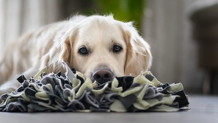 Breiten Sie die Fleecedecke aus und schneiden Sie viele gleichgroße Streifen heraus (4-5 cm breit und 20 cm lang). Die Anzahl richtet sich nach der Größe der Matte und der Dichte des Schnüffelteppichs, je mehr Streifen Sie später einknoten, umso dichter wird er.