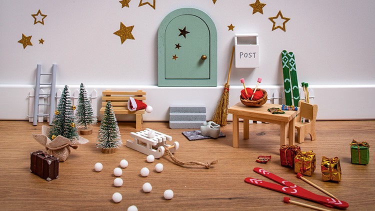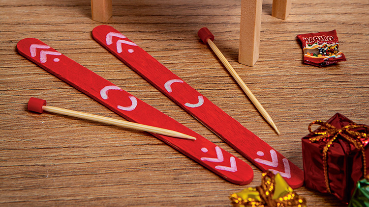 Für die Skier 2 Eisstiele nach Wunsch bemalen. Für die Skistöcke je 1 Ende der Zahnstocher in Kleber tauchen, Bügelperlen aufstecken und kurz trocknen lassen.