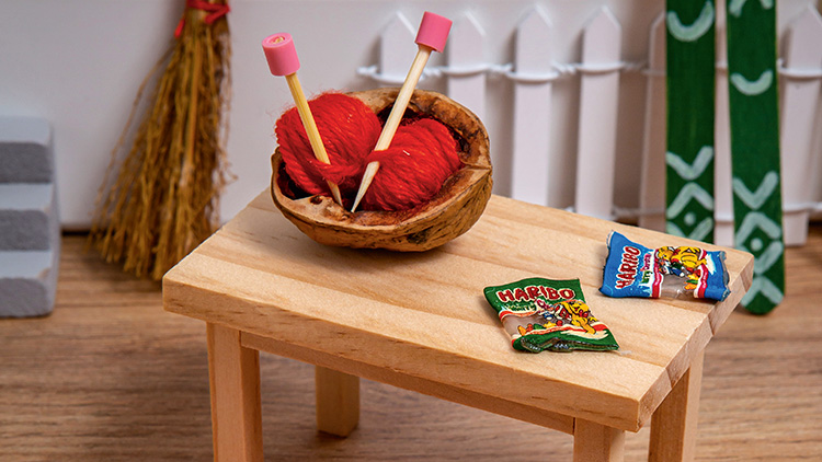 Für den Wollkorb Walnuss mit einem Nussknacker vorsichtig in 2 Hälften brechen und das Innere entfernen. Wollrest in 2 Knäuel wickeln, Fadenende jeweils fixieren. Zahnstocher mittig durchschneiden. Stumpfe Enden in Kleber tauchen und Bügelperlen aufstecken, kurz trocknen lassen. Wollknäuel in eine Nussschalenhälfte legen und die Zahnstocher-Stricknadeln einstecken.