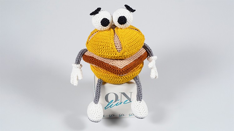 Die Hände an einem Ende der Arme annähen und die beiden Füße je an einem Ende der Beine annähen. Die Arme werden an je einer sich diagonal gegenüberliegenden Ecke des Fleischkäses angenäht. Die Beine vorne so an den Brötchen-Unterdeckel nähen, dass die Figur sitzen kann und die Beine frei baumeln können. Fleischkäse und Oberdeckel auf den Pin am Unterdecke aufstecken.