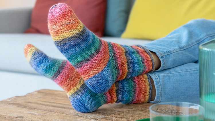 Schlage die angegebene Maschenzahl (siehe Tabelle: 64 M) für die gewünschte Größe an und verteile diese gleichmäßig auf 4 Nadeln (pro Nadel 16 Maschen). Arbeite in Runden, der Rundenanfang ist die rückwärtige Mitte des Sockens.